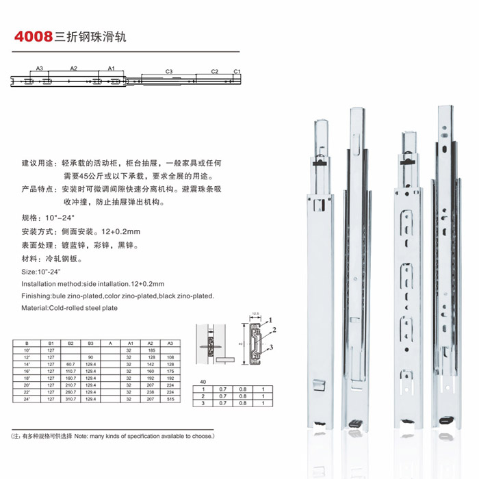 聯眾五金:4008三節鋼珠滑軌